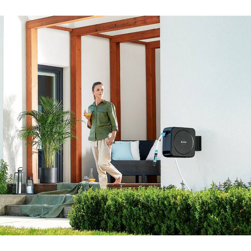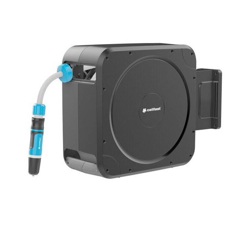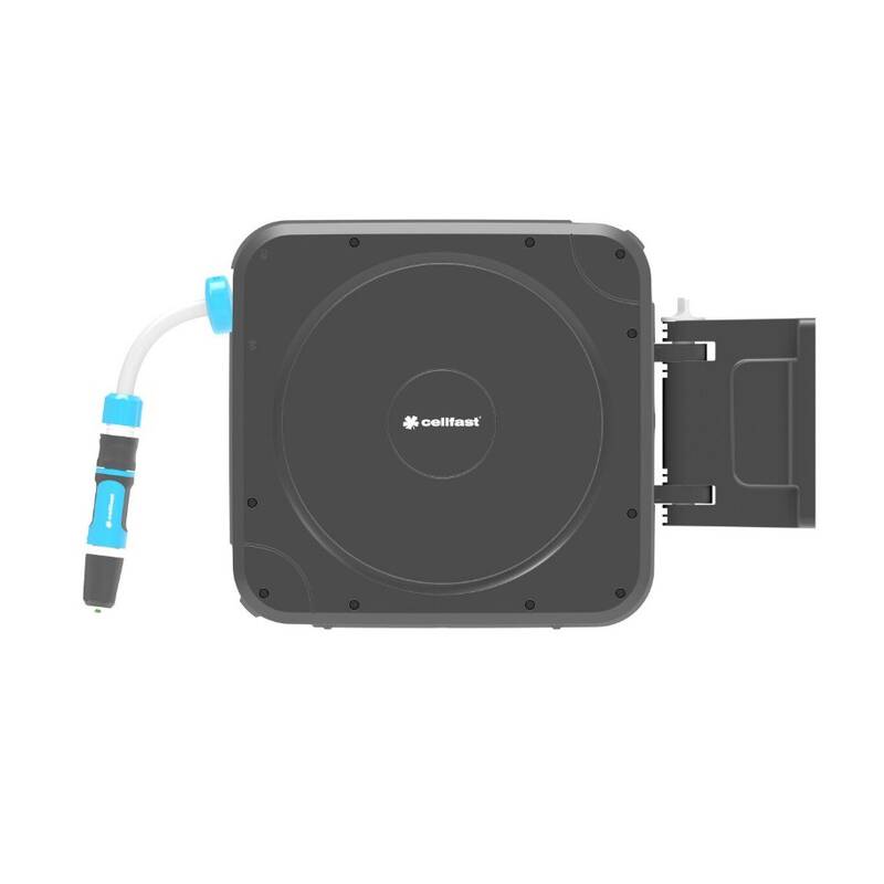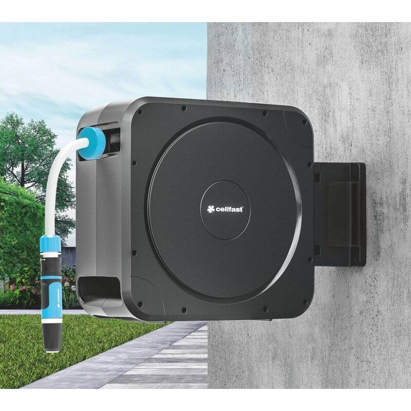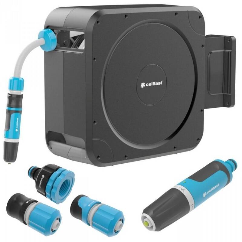 Автоматическая катушка ERGO изготовлена из высококачественного материала, устойчивого к ультрафиолетовому излучению. Эффективный тормозной механизм, регулирующий скорость намотки имеет блокировку оборота, которая предотвращает повреждение фасада здания. Прочное настенное крепление позволяет монтировать катушку на стену и вращать ее на 180°. Эргономичные ручки с обеих сторон позволяют легко переносить и подвешивать катушку. Комплект содержит: катушкy для шланга, настенный держатель, шланг 20 м, комплект для подключения со шлангом 2 м, наконечник ERGO, коннектор с аквастопом ERGO, универсальный штуцер с внутренней резьбой G1/2” - G3/4” - G1”.