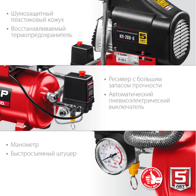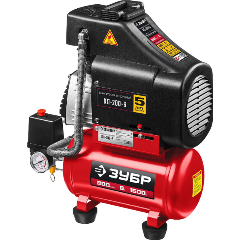 Компрессор воздушный ЗУБР КП-200-6, предназначен для накопления, хранения и подачи воздуха. Компактный и надежный безмасляный компрессор с поршневым типом пневматического механизма. Готов к работе сразу после покупки. Вырабатываемый воздух не содержит примесей масла, что не требует установки дорогостоящих маслоотделителей. Поршневой тип компрессора наиболее производителен среди другим типов. Не требует заправки маслом и контроля за наличием и его замены. Прямой привод упрощает конструкцию и увеличивает надежность. Выключатель давления обеспечивает автоматическое включение/выключение изделия при расходе сжатого воздуха. Сменный воздушный фильтр на входе защищает цилиндро-поршневую группу от абразивного износа. Быстросъемный штуцер обеспечивает удобное и быстрое подключение и отключение пневмоинструмента. Контроль давления в ресивере и на выходе при помощи двух манометров. Самовосстанавливающийся термопредохранитель. Регулировка давления на выходе.