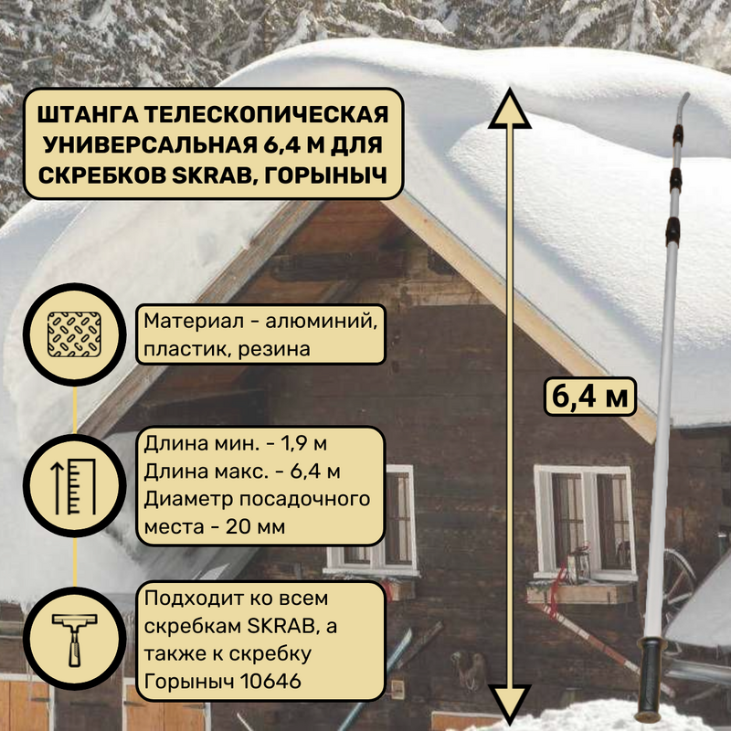 Штанга телескопическая универсальная 6,4 м для скребков SKRAB, Горыныч выполнена из прочного алюминиевого сплава, она не гнется и не подвержена коррозии. Колена закрепляются между собой пластиковыми соединениями в форме скоб из морозостойкого пластика, они надежно работают до -40 градусов.