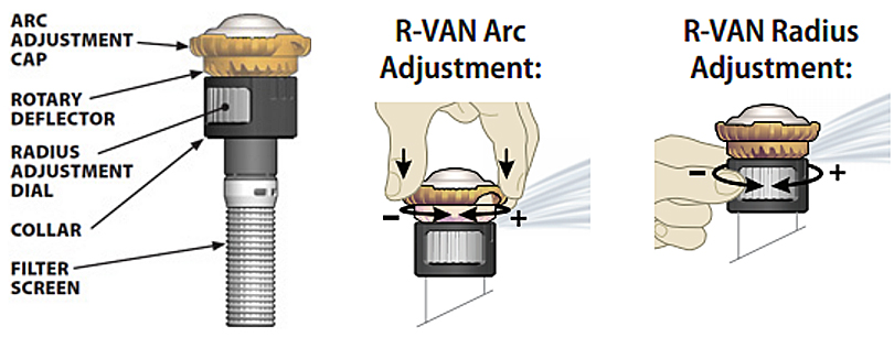 Сопла серии R-VAN обеспечивают эффективное использование воды за счет технологии вращающейся струи, которая равномерно распределяет воду при низком количестве осадков, значительно снижая размывание и эрозию почвы. Замена стандартных форсунок регулируемыми вращающимися форсунками R-VAN позволяет понизить расход воды до 60 % и повысить ее эффективное использование до 30 %.