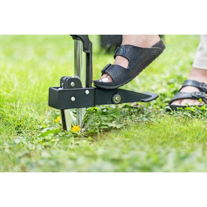 Позволяет на легкое удаление сорняков без использования химических средств. Длинные шипы из нержавеющей стали захватывают корень с четырех сторон, удаляя растение вместе с длинным корнем. Удобная и простая система регулировки длины рукоятки от 990 мм до 1190 мм. Эргономичная ручка в форме буквы D обеспечивает комфорт работы, а подставка под ногу облегчает вбивание.